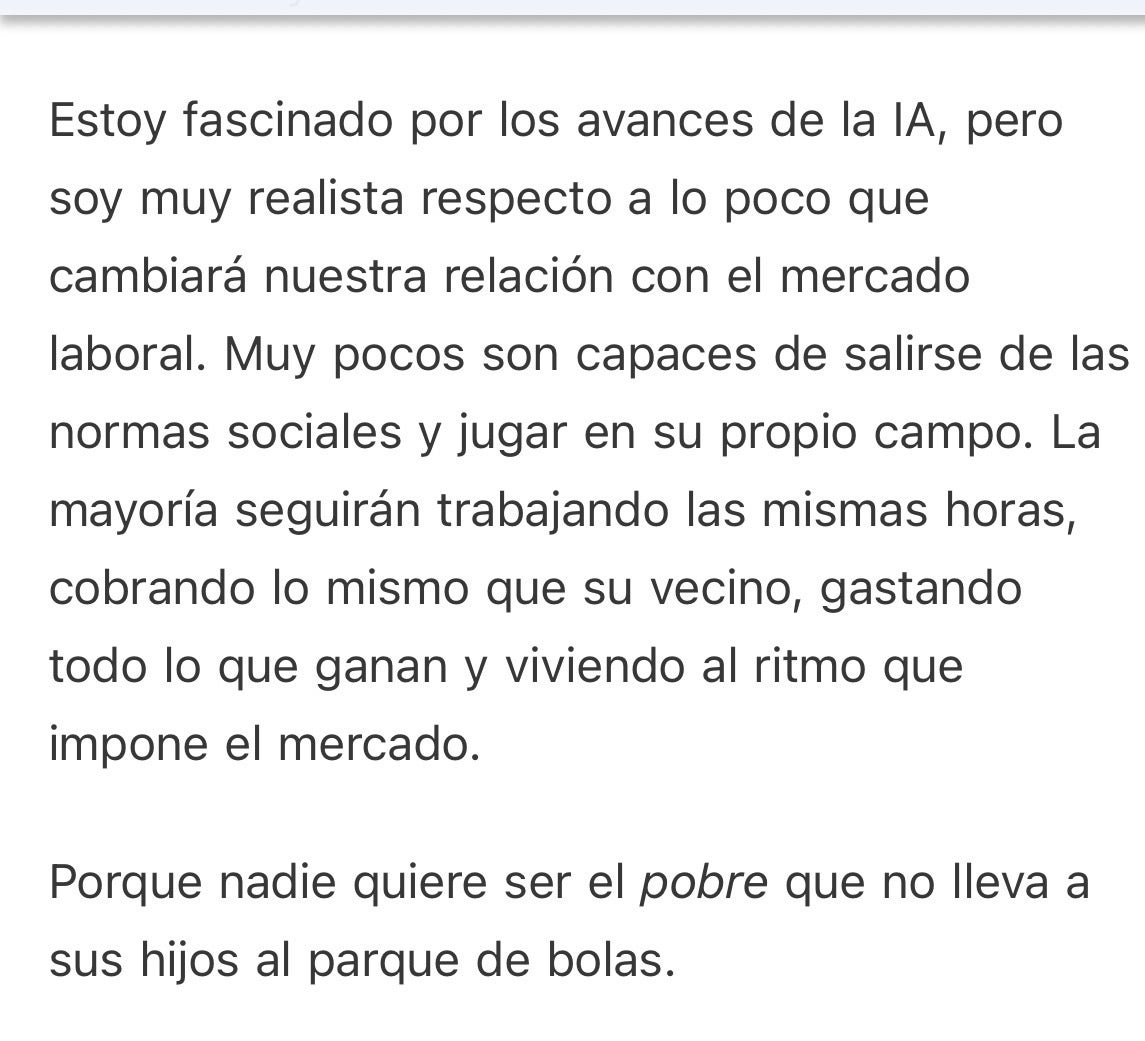 Estoy fascinado por los avances de la IA, pero soy muy realista respecto a lo poco que cambiará nuestra relación con el mercado laboral. Muy pocos son capaces de salirse de las normas sociales y jugar en su propio campo. La mayoría seguirán trabajando las mismas horas, cobrando lo mismo que su vecino, gastando todo lo que ganan y viviendo al ritmo que impone el mercado.